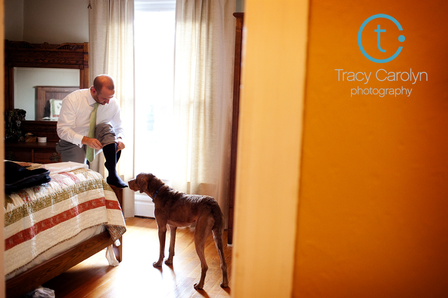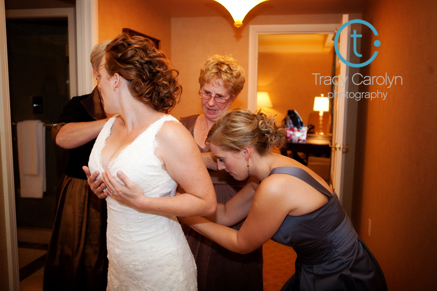 We found refuge in the parking garage for the Museum of Nature and Science, and waited out the storm. But it didn’t pass quickly enough, and their outdoor ceremony had to be redirected to another location. But where? The officiant suggested the parking garage, since guests already knew to arrive there. Leslie and Peter considered it for a moment, but we all know how photogenic a parking garage is. So they opted to try the reception space, Mise en Place in the Ice House building downtown. When we arrived I helped them scout for a location, and it became clear that Mise en Place didn’t have a suitable spot for a ceremony. But the lobby of the building had potential, and despite the somewhat steady stream of restaurant patrons moving through the space, it was the best option.