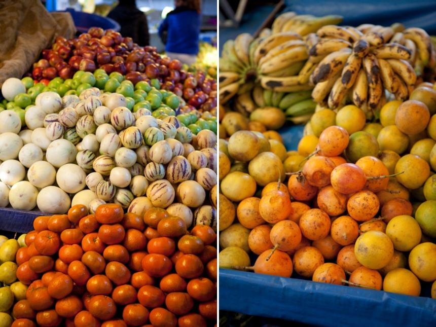 Our cooking class began with a trip to one of the local markets, where Erick schooled us on some of the local produce. We even sampled a few things we’d never had before. The white fruit with purple stripes is a mix of cucumber and melon – it tastes refreshing and slightly sweet, and would probably be yummy in a salad. On the right is one of the many types of passion fruit. This one was a bit too sour for my taste.