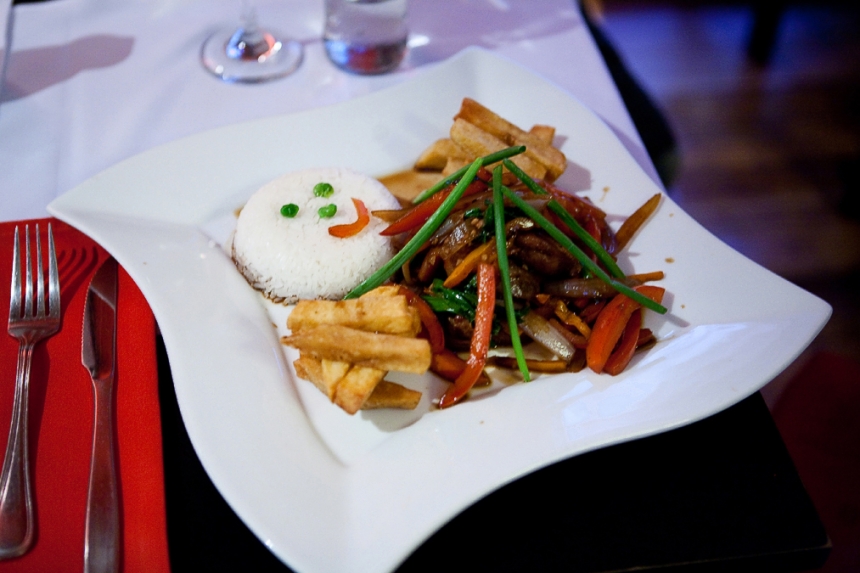 Peruvians serve alpaca saltada with fried potatoes and rice. (It’s commonplace here to eat potatoes and rice together, which most visitors – including me – find odd. Erick said that’s just how they do it, and with 4,000 varieties of potatoes to eat, I’m not surprised.) It was good, but so filling we had to take half home. Below is my dish (John’s is the first one of this post.)