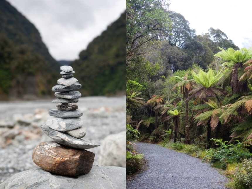 Odd as it seems, the walk to the glacier is mostly through rainforest. (Also, I did not set up those rocks, I found them that way. I don’t know why I feel the need to say that, but I do.) The weather in this area of New Zealand forms glaciers because of the very high amount of rainfall and rather steep mountains. That rainfall collects and freezes,creating the glacier. The parts of the valley where the glacier has receded are full of rainforest. All that rainfall also means – you guessed it – lots of waterfalls.