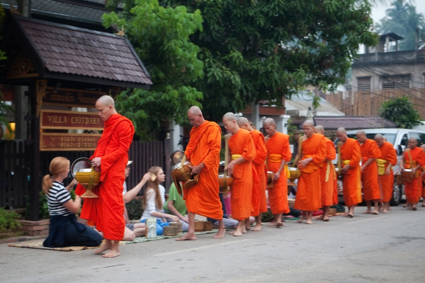 Since the ceremony is so impressive it has become quite the tourist draw. Most of the people giving alms now are tourists, and the roads are full of travelers with cameras documenting the event. Unfortunately, many of them are invasive and disruptive to the process, getting quite close to the monks to snap photos and chatting when they are supposed to be silent. (I realize the irony of me saying this, given the photos I took, but I stayed across the street and did my best to be unobtrusive and respectful. I did not use a flash and I took all of four photos.)