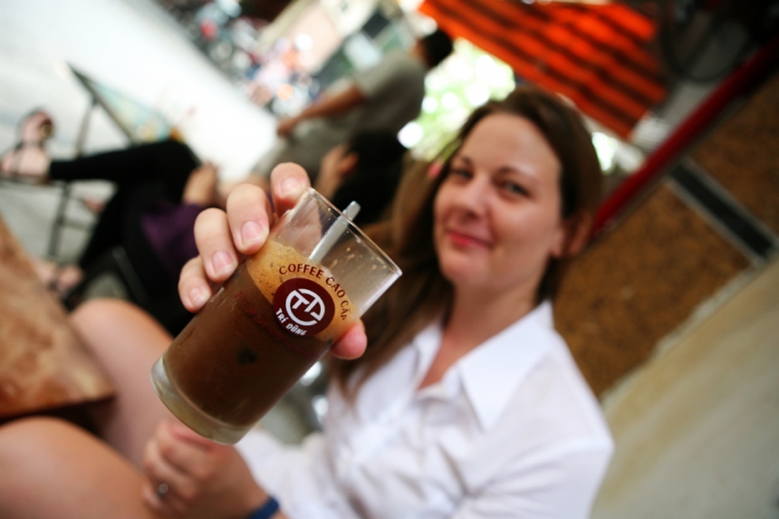The coffee itself is a finely ground and strongly brewed dark roast. You can order it black or white – white meaning it comes with a layer of sweetened condensed milk on the bottom of the glass with the coffee poured on top of it. You stir it up with a spoon to create the milky colored coffee I’m holding above. I think it’s best served iced and enjoyed over a long span of time. It’s so delicious I could drink three of these in a day, but I had to limit myself to one every few days. Can’t have caffeine withdrawal kicking in when we get to Laos and these little cafes aren’t everywhere…