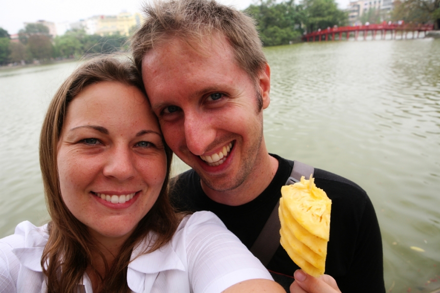 (By the way, there is something seriously wrong with the above map.  If Vietnam was that large I certainly shouldn’t have had to spend so many hours on flights from Australia…)An iconic image from Hanoi, this is the red bridge leading to Ngoc Son Temple in Hoan Kiem Lake.  Me, John, and some amazing pineapple purchased from a street vendor posing with the bridge…There are women on bicycles selling everything from fresh cut flowers and produce to carpets.A Hanoi outdoor restaurant, similar to the ones in Saigon.  At lunchtime the small tables and chairs spill out onto the sidewalk and into the streets, full of patrons slurping noodles and drinking tea.  This shot is from after the lunch rush, when the restaurant was quiet.Another streetside restaurant.  John, by the way, looks hilarious eating at these tiny tables.  His knees come up to his armpits and he’s totally hunched over trying to scoop food into his mouth.  He is seriously a cartoon character sometimes.  :)They start them young on those motorbikes…I don’t know how this guy balances with all those carpets, but somehow he was planning on moving.This cannot be the most efficient way to roast a chicken.  Maybe she’s just putting the finishing touches on it?The parade of rickshaws at night – they are all over the city pushing tourists through the streets.We had just one last day in Hanoi, and then our tour of Vietnam was over.  Onward to Laos!