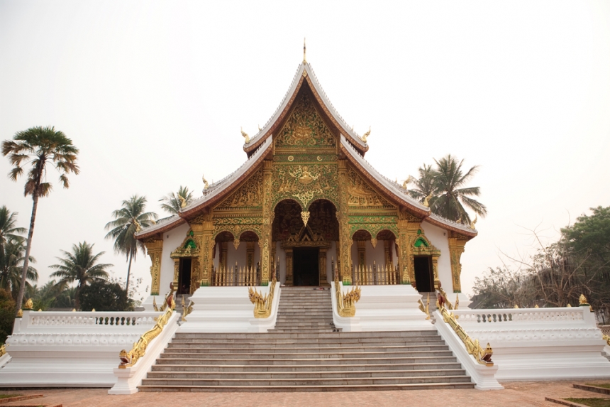A reclining Buddha.This Buddha is very tall….…and appears to have Dutch style footwear…The view from the top of the hill is supposed to be spectacular, but because it is burning season in Northern Laos most of what you can see is smoke and haze.  Locals are burning farm land and underbrush to prepare for the upcoming farming season.  It smells like a nice campfire when you wake up every morning and the air is still chilly, but when the heat of the day hits it becomes a bit oppressive.Elsewhere around town you can’t walk two blocks without seeing a temple.  Literally.  And every one of them is ornate and beautiful.There is such detail on the doors, and inside the temples the walls are completely covered with painted murals.  Seeing as there are several monasteries in town, there are also hundreds of monks.  They do much of the upkeep on these temples themselves.  On more than one occasion I witnessed monks painting temples, climbing on roofs to make repairs, and working with power tools on various projects.Wat Xieng Thong, the oldest and one of the most important Laos monasteries.  Inside there are hundreds of Buddha statues and ornate paintings.  The outside of other buildings on the grounds have beautiful tile work.We’ve become familiar with a few variations of tuk tuks from various parts of the world, but this is a new one for us.  It is driven like a motorcycle while passengers sit in what is essentially the flat bed of a truck.  Not as bumpy as you might imagine.