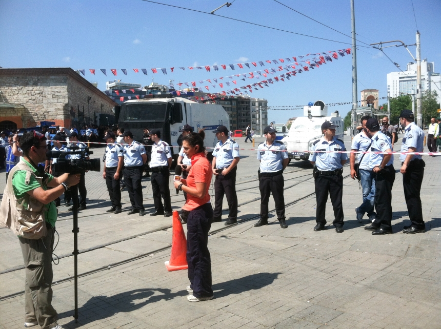 At 2:30pm we grabbed our backpacks and hopped a cab to Taksim Square, aiming for the Burger King. As we approached the neighborhood, the taxi stopped in front of a street closure barricade and let us out, the driver instructing us that we’d have to walk the rest of the way. Together John and I walked the few blocks up the street, wearing our huge tourist backpacks and using an app on my iphone to lead us to our designated meeting point. The area was rather calm and quiet, with a few police officers sitting calmly on the sidewalk and pedestrians walking through the closed off street. Following the map, we turned down a smaller alleyway, onto what looked like a pedestrian mall, and spotted the Burger King. It took only a moment for the adrenaline to start pumping – the Burger King was located literally at the front lines of a police barricade on the edge of the square. There was a reporter filming a segment in front of the line, and people milling around us with cameras and gas masks. The Burger King – and nearly every other shop and restaurant nearby – was closed for business. Confused and feeling completely out of place, I snapped this photo with my iphone before we headed down the pedestrian mall to call Faruk and regroup.