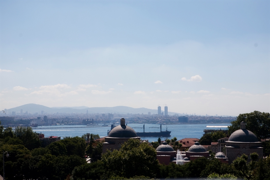 After much discussion, I decided that we should ring in my third decade with champagne and cheesecake, simply because we never have them and it might make the occasion feel special.  However, trying to find either of those items in Istanbul turned out to be more of a challenge than I anticipated.  Not wanting to spend the evening hunting down two things that I had chosen on a whim anyhow, I opted to go local.  We had a delicious dinner at a Turkish restaurant nearby, and then with a half bottle of Turkish red wine and two pieces of Baklava in hand, John and I climbed the stairs of our hotel and sat on the rooftop to enjoy dessert with a view.  It largely resembled a night spent on the rooftop just a few days earlier, but I didn’t care.  Who needs ‘special’ when every day looks like this?  (Besides, it sure beat the pants off the way I celebrated twenty nine.)